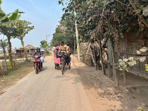 After the meeting, we departed for village visits using a “van,” essentially a motorized tricycle with a small flatbed. The locals seem a bit puzzled by the excessive delight the Americans take in their novel form of transportation.