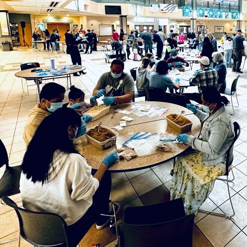 In recent years, there have been certain Sundays that limit our access to the PAC at BLHS which we rent every Sunday for our weekly in-person service (Robotics Tournaments, School Musicals). Add in the annual Women's Retreat which concludes on Sunday morning, there were decisions to be made as to what we would do without access to the venue and less people in service. It is Craig Groeschel that has coined the phrase "limitation breeds innovation". When one door is closed another opens, and this is the case every year for Open Life. So we thought of a creative way to pivot our regular scheduled Sunday Service and move everyone over to the Commons at BLHS and do a Serve project that would benefit the local food bank. What is possible when we gather a bunch of people ready to serve with the supplies that are needed within the community over the coming months? Well, we packed through hundreds of individual bags of spices and oatmeal, all while having a blast serving together.