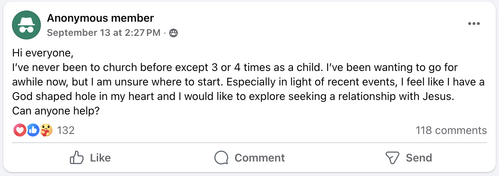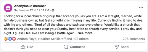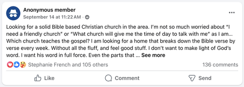 The past few weeks have brought about something that has not occurred in quite some time: people are seeking to return to church or maybe try church for the first time on their own initiative. And the way they are trying to find a church to go to is by asking on community social forums. See a few here from the Bonney Lake Community Group on Facebook.