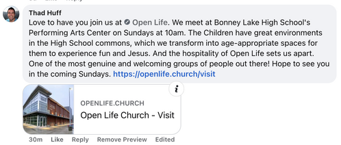 What this does is insert a graphic below your comment. I made this post for someone asking about kids and if they would feel welcome at the church, but again, from a pastor, it isn't as powerful and sounds kinda like an advertisement, when from a family attending would be amplified through personal experience. But none the less you can see how it might appear when you paste a url and allow Facebook to insert a graphic from the website. In this instance, I pasted the Visit page from our website as you can see highlighted in blue.