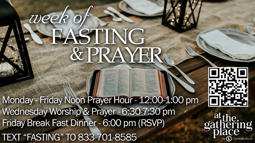Different for 2026 is the form the week takes to guide you as you fast and pray during the week of the 5th through the 9th. We will create daily prompts that will be made digitally accessible, text the word "Fasting" to 833-701-8585 for these prompts. The Gathering Place will be open for anyone who wants to stop by and pray at Noon each day, Monday-Friday. In addition, we will host an hour of worship and prayer together at theGP on Wednesday at 6:30 pm.