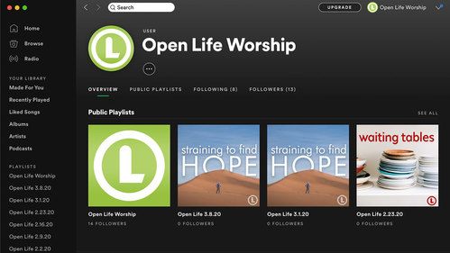 Open Life shares the songs we do every week on our Spotify, Apple Music, and Youtube accounts. Follow the playlists and tell your smart device to “play the open life worship playlist”.